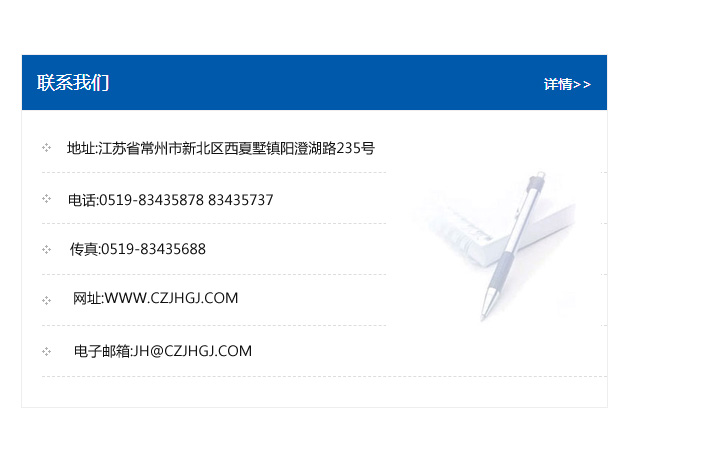 地址:常州市新北區友邦商務大廈1幢16、17層  電話:0519-85101652  傳真:0519-85112595  郵編:213022  網址:www.cz-jiayue_cn.bjrenju.com  郵箱:xiajifengaa@163.com